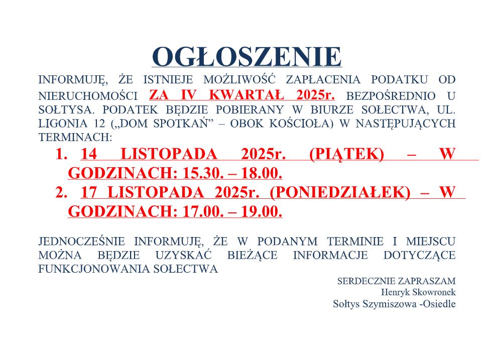 Pobór podatku od nieruchomości za IV kwartał 2025